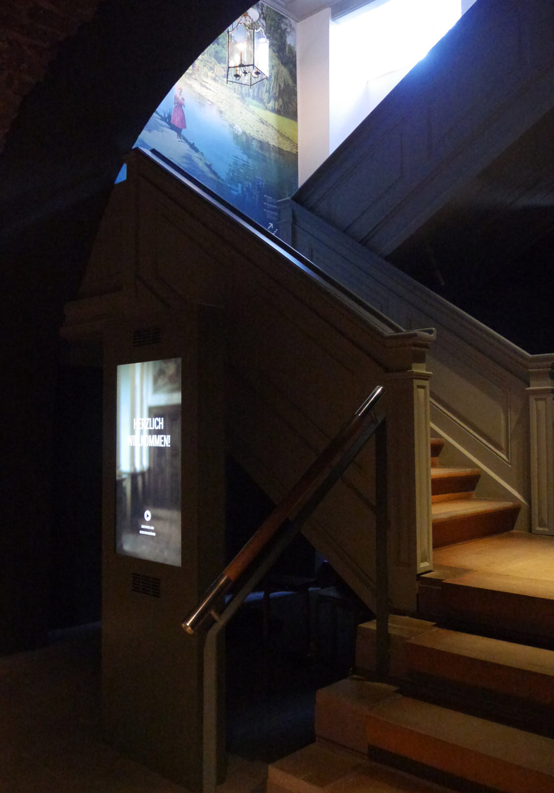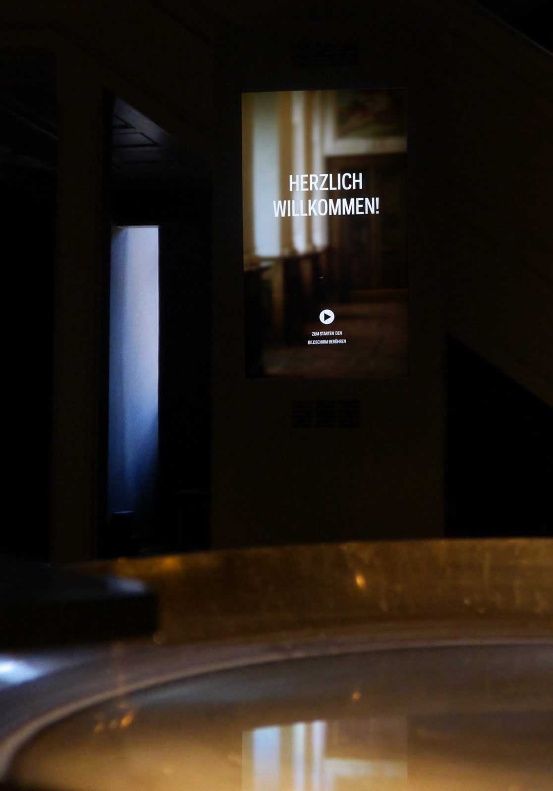 Ein Imagefilm auf einer vertikalen Medienstation begrüßt den Besucher und gibt ihm einen ersten Einblick in die ständige Ausstellung im Schloss Pyrmont.